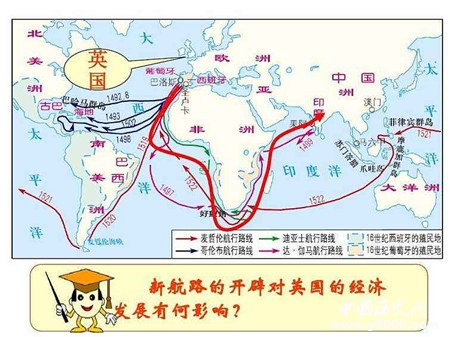 隨著新航線的開辟,世界貿(mào)易中心轉(zhuǎn)移到了大西洋沿岸。這對(duì)于處在大西洋航運(yùn)中心的英國來講,無疑是個(gè)有利條件。因此英國加強(qiáng)海外貿(mào)易活動(dòng)。海外貿(mào)易市場(chǎng)的開拓,促進(jìn)了英國傳統(tǒng)工業(yè)制呢業(yè)的發(fā)展,手工工場(chǎng)便如雨后春筍般出現(xiàn)了。隨后,手工工場(chǎng)的范圍不斷擴(kuò)展,涉及到采煤、煉鐵、造船等領(lǐng)域,資本主義得到了快速發(fā)展。