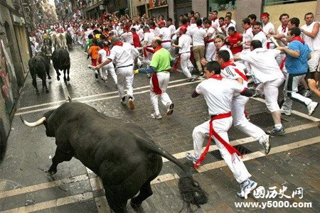 “圣費爾明”是西班牙東北部富裕的納瓦拉省省會潘普洛納城的保護神。奔牛節(jié)起源于西班牙斗牛。據(jù)說當初對潘普洛納人來說,要將6頭高大的公牛從城郊的牛棚趕進城里的斗牛場是件非常困難的事情。16世紀時,觀看的人突發(fā)奇想,斗膽跑到公牛前,將牛激怒,誘使其沖入斗牛場。后來,這種習俗就演變成了奔牛節(jié)。
