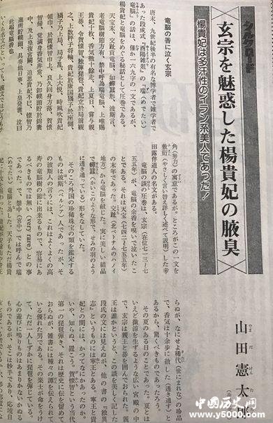 在日本新人物往來(lái)社編制的《別冊(cè)歷史讀本》雜志《絲路之夢(mèng)與冒險(xiǎn)記錄》??校吹搅耸鹈教飸椞傻囊黄恼?,如果直譯其題目,應(yīng)該是《魅惑玄宗之楊貴妃的腋臭》。