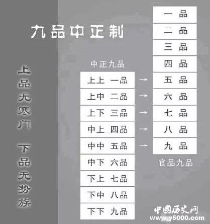 中正就是品評(píng)人才的官職名稱。大、小中正產(chǎn)生后,由中央分發(fā)一種人才調(diào)查表,在該表中將人才分為九等,上上、上中、上下、中上、中中、中下、下上、下中、下下。