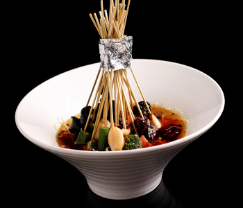 鹵水鍋置旺火上,使之保持小沸,將各類菜用串好的竹簽燙制,根據(jù)不同菜肴的火候燙制成熟。