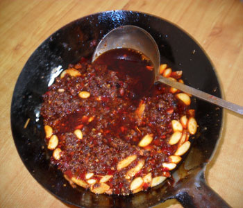 炒制前先把全部香料剪成2寸長的小段,有條件的朋友也可用粉碎機打成芝麻粒大小的碎末,用色拉油或者溫水浸泡大約20分鐘。準備2口炒鍋,一個里面放(豆瓣、大蔥、生姜、醪糟、白酒25克、大蒜、碎米牙菜、豆豉、冰糖)共9樣拌勻。另一口鍋內(nèi)加入3斤牛油(或者2斤牛油加1斤雞油)熬化,然后加入色拉油(最好用菜籽油)燒到7-8成熱,用勺子把油舀到拌勻豆瓣上面,邊淋油邊攪拌,以免豆瓣焦化。直到油淋完為止。然后將豆瓣置火上用中火熬制10分鐘左右,豆瓣快干水氣時下滋粑辣椒,改用大火炒制,當油沸騰時馬上改用小火熬制,15分鐘后加入白酒25克左右,繼續(xù)炒制,直到各原料水分快干時加浸泡好的香辛料,繼續(xù)炒制5-10分鐘即可。