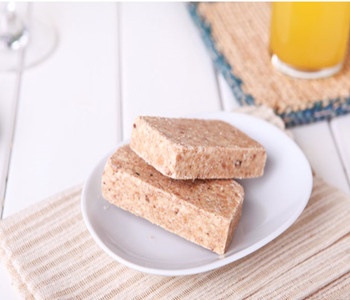 首先準(zhǔn)備壓縮餅干配料:膨化粉5公斤白糖1公斤、花生油1公斤、食鹽50克、芝麻250克、水530克。配料前先測試膨化粉的含水量,以便掌握水量,然后進(jìn)行調(diào)粉。先加油,調(diào)勻后,再加水,攪拌均勻。調(diào)粉時(shí)溫度不能太低,否則易結(jié)塊。粉溫最好在145~145℃為宜。粉調(diào)好后進(jìn)行壓模,模的規(guī)格為4×8厘米,高7.5厘米,壓力90公斤/厘米2,每塊重62.5克,每兩塊裝一包,標(biāo)準(zhǔn)重125克。成品含水量不超過6%。而其中要特別注意的是:膨化粉顆粒不能太細(xì),如果太細(xì),溫度太低,調(diào)粉時(shí)易于結(jié)塊。各種糧食膨化粉的體積不同,壓制時(shí)壓力也應(yīng)不同。其壓力大小應(yīng)該是使產(chǎn)品的體積和重量不變。用油的品種也應(yīng)有所選擇,以便更好地貯存。