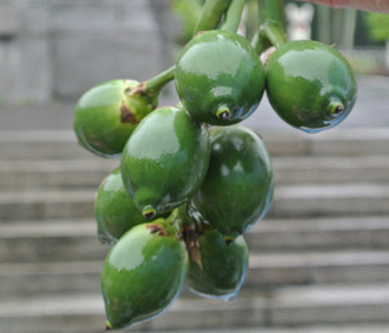 2、將檳榔削成瓣,用栳葉包住,配上石灰膏和煙絲,放入口中細(xì)嚼,吃的人像喝了酒、面色發(fā)紅,精神煥發(fā)。