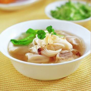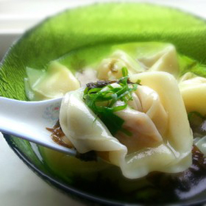 3、煮餛飩時(shí)開水下鍋,等餛飩浮上來就好了。餛飩皮薄,久煮易爛,所以肉餡不要包得太多。餛飩多與湯底搭配,可以用高湯,也可直接在清湯中加入各種調(diào)料來調(diào)制湯底,配料可以選蝦皮、紫菜、榨菜、蛋皮絲等,最后滴上幾滴香油,撒上少許香蔥就非常美味了。