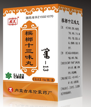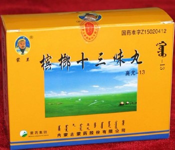 檳榔十三味丸是利用不同的制作方法“檳榔十三味丸蒙藥療法”,由檳榔、沉香、肉豆蔻、丁香、木香、廣棗、制草烏、干姜、蓽茇、胡椒、紫硇砂、當歸、葶藶子這十幾味中藥制成。檳榔十三味丸能鎮(zhèn)赫依、安神止痛、通利白脈傳導、促進血液循環(huán),從而改善神經(jīng)沖動的傳導和調節(jié)神經(jīng)肌肉興奮的作用,并且檳榔十三味丸無副作用,復發(fā)率低,療程短。