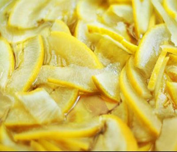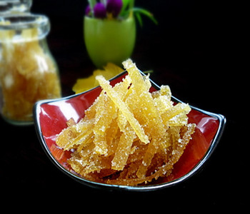 3、腌制。將表皮削去,注意要把全部青色的都削去,要不然會有點苦。然后把它橫著切成一條條,注意要切薄點。放在開水中煮一下,然后就放在涼水中浸一兩條,期間要換一兩次水,換水時注意要先擠掉皮的水分,再放進新水中。一兩天后,把皮擠去水,稍微量一下,備用。然后煮些白糖,煮成水后放皮一起進去煮一會。這樣就做成柚子糖了。