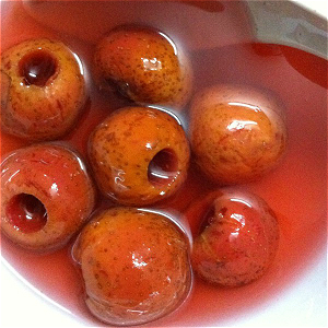 3、去掉果核的山楂用冷水浸泡,一是防止山楂去掉果核的部分遇空氣氧化變色,二是山楂開始經(jīng)過熱水軟化再用冷水浸泡,也可以保證山楂熬煮過程保持形態(tài)完整。