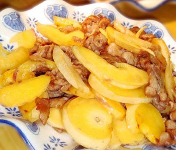做法:將人參果去蒂、洗凈、切片;再將豬肉洗凈、切薄片;油鍋燒熱下肉片煸炒,七八成熟時(shí)加入人參果片和佐料,再炒熟裝盤即可。