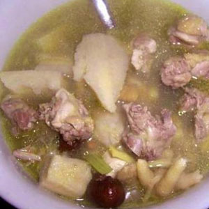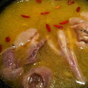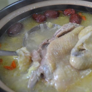 2、把雞、姜片、核桃仁、棗、榴蓮皮與榴蓮肉同放入鍋內(nèi)滾開水中,加姜片,用猛火滾起后,大火燒開 ,小火熬煮2個小時。枸杞子最后十分鐘加。湯好后放鹽調(diào)味即可飲用。榴蓮飄香的季節(jié),買榴蓮的時候 不妨把榴蓮殼也帶回家,熬上一鍋湯,補氣健脾,還很養(yǎng)顏的。