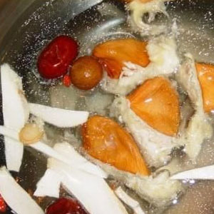 2、一起與生姜放進(jìn)瓦煲內(nèi),加入清水適量,用大火煲沸后改為文火煲至2小時(shí)。調(diào)入適量的食鹽和少許生油即可。
