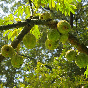 榴蓮樹,常綠喬木。榴蓮是熱帶著名水果之一,原產地是泰國。葉片長圓,頂端較尖,聚傘花序,花色淡黃,果實足球大小 ,果皮堅實,密生三角形刺,果肉是由假種皮的肉包組成,肉色淡黃,粘性多汁是一種極具經濟價值的水果 。