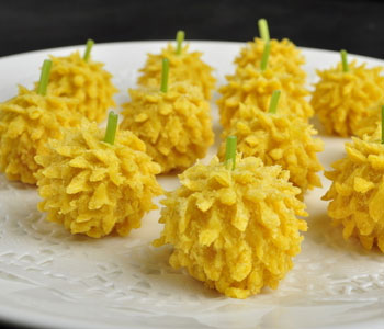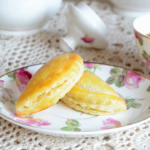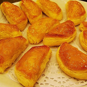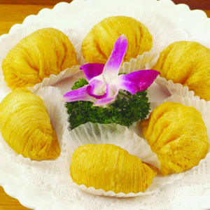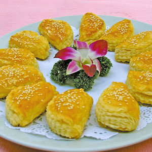 金黃誘人的榴蓮酥以新鮮榴蓮果肉配制的軟滑餡心,配以層次分明、異常松化、做工精細(xì)的酥皮,令人食 指大動(dòng)。吃完后淡淡的榴蓮味讓人“榴蓮”忘返。
