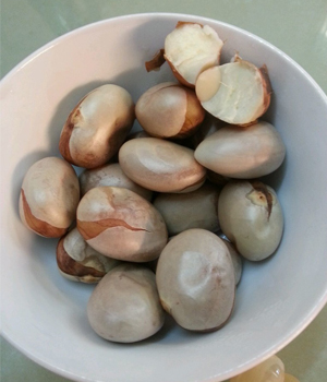 鑒定質(zhì)量方法:習(xí)慣有擦皮聽聲。擦皮時果殼瘤狀突起物硬脆易斷,無乳汁,聲音混濁,為已熟果。