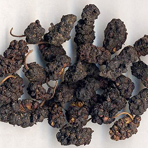 中藥桑葚是桑葚的干果,干燥果穗呈長(zhǎng)圓形,長(zhǎng)1~2厘米,直徑6~10毫米。基部具柄,長(zhǎng)1~1.5厘米。表面紫紅色或紫黑色。果穗由30~60個(gè)瘦果聚合而成;瘦果卵圓形,稍扁,長(zhǎng)2~5毫米,外具膜質(zhì)苞片4枚。