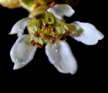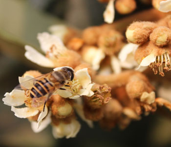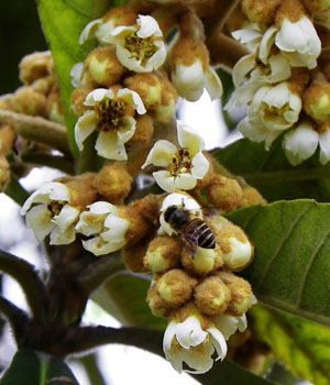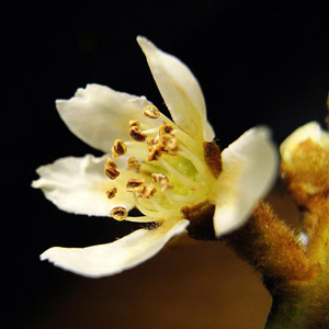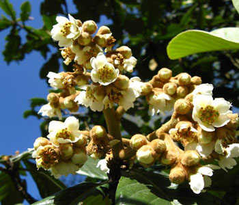 枇杷花冬月開(kāi)花,黃白色,眾花成簇具有香氣,花瓣五出淺裂蒂大。枇杷花中含有一定量的揮發(fā)油和低聚糖,性質(zhì)比較偏溫性,味道微甘,可以入藥。