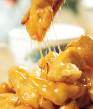 4、炒勺留點(diǎn)底油,放入白糖炒到金黃色,大泡變小泡,最后顏色加深,可以拔絲時(shí),倒入香蕉塊、青、紅絲,快速顛翻均勻,盛入預(yù)先擦好一層油的盤(pán)中,擺整齊即成。
