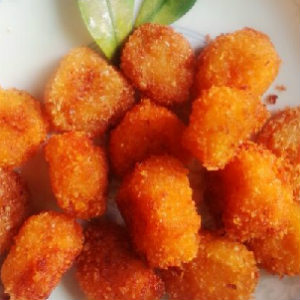 2、凈鍋上火,注入色拉油燒至四五成熱,將柿子糊用手?jǐn)D成丸子,下入鍋中炸至色呈金黃且熟時(shí),撈出瀝油裝盤,最后撒上少許白糖,即成。