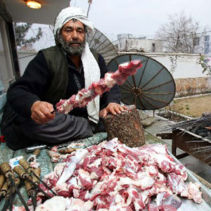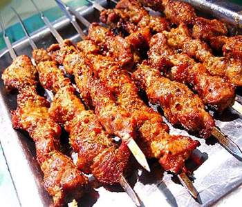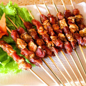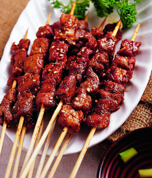 材料:瘦羊肉500克、精鹽15克、胡椒粉5克、芝麻50克、小茴香3克、孜然5克、花椒粉5克、面粉15克味料(辣椒粉)少許。