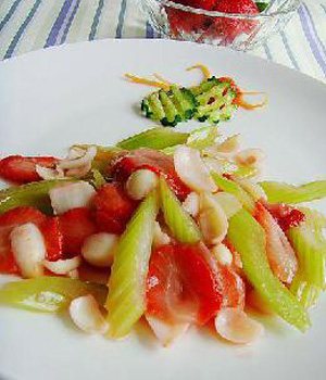 1、臘肉切成片,西芹去筋切成片,百合瓣開洗凈,草莓切成片