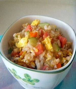 火腿200g,米飯400g,雞蛋2個,胡蘿卜50g,黃瓜30,蔥花10g,油15ml,醬油5g,鹽5g