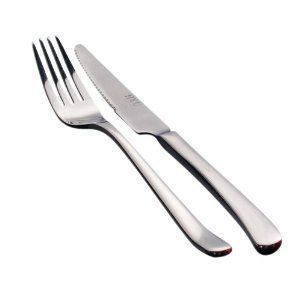 切的時(shí)候:左手的叉子按壓住牛排或其他事物,右手的刀子開切,鋸成小塊,左手叉子叉起切好的食物送入口中。