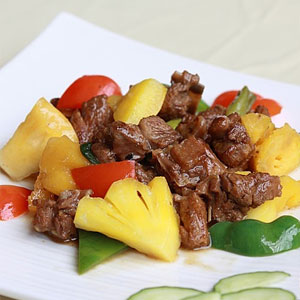 4)鍋加少許油燒熱,底上先放入蔥和姜片, 然后分別碼入鴨塊和菠蘿塊, 倒入備好的料汁,加蓋煲約40分鐘即可。