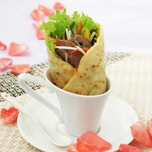 4)攤開面餅,涂抹調(diào)好的面醬,依次擺放生菜、鴨肉片、蔥、黃瓜、甜椒,卷成餅狀即可。