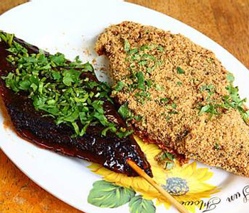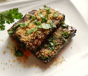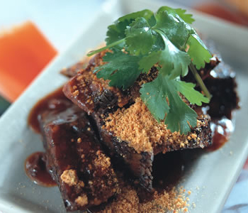 6、將豬血糕切成長條狀,以竹簽穿過,放入蒸籠內(nèi)蒸約5分鐘至熟,蒸好的豬血糕先沾醬油膏再沾甜辣醬后,拌入花生粉與香菜即可。