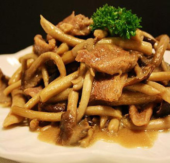 材料:茶樹菇、鴨肉、雞粉、生抽、調(diào)和油、生粉、胡椒粉、白糖、芝麻油