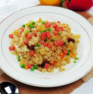 食材準備:火腿腸、雞蛋、蔥花、豌豆、玉米粒、蝦仁、米飯、調味品