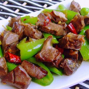 材料:青椒、豬心、食鹽、醬油、味精、糖、料酒、淀粉、姜片、蒜末