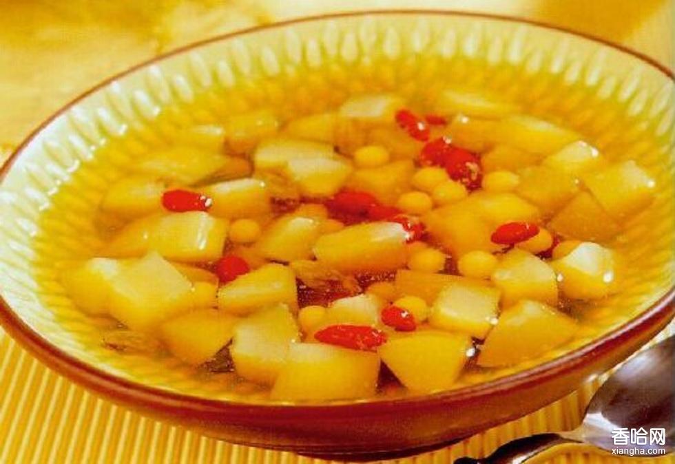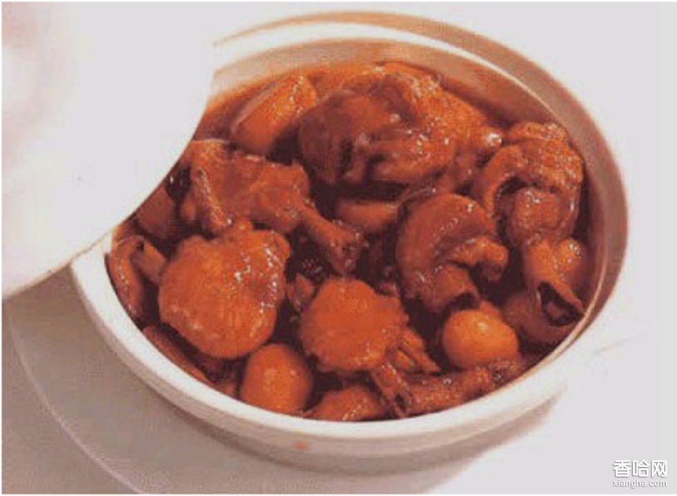 原料:雞蛋14個(gè),煮熟的人參果2錢、鹽3克、酥油1兩、水?dāng)嚭投狗?錢。做法:洗好的人參果在水中煮熟。雞蛋的蛋清和蛋黃分開(kāi),加上鹽和水?dāng)嚩狗酆蠓旁谡艋\中蒸熟。蒸熟的蛋清,蛋黃切成塊狀、擺在菜碟中,蛋清、蛋黃塊上插好人參果。菜鍋中再放少許酥油再微火中化成液體后加上少量的水?dāng)嚩狗壑笾脸霈F(xiàn)沸泡的時(shí)候澆在菜碟中的雞塊上,蛋插人參果這道菜做成了。