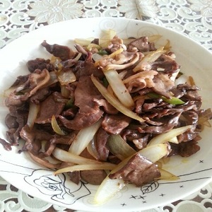 2、豬心洗凈對(duì)半剖開,再切成薄片,放入碗內(nèi)。然后加適量鹽、醬油、糖、酒、味精、淀粉、水拌勻腌一下待用。