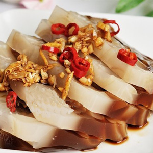 制作要領:水最好一次加足,如覺得燉好的湯汁不夠黏稠,可再繼續(xù)開火再熬一熬。煮的時候不加生抽便是白色有些透明的凍。也可不放蔬菜丁,那可是純粹的豬蹄凍!
