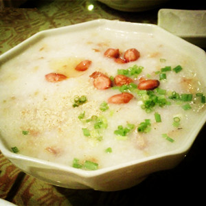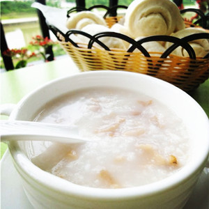 原料:豬骨500g、花生米60g、粳米150g、芫荽適量、蔥花少許。