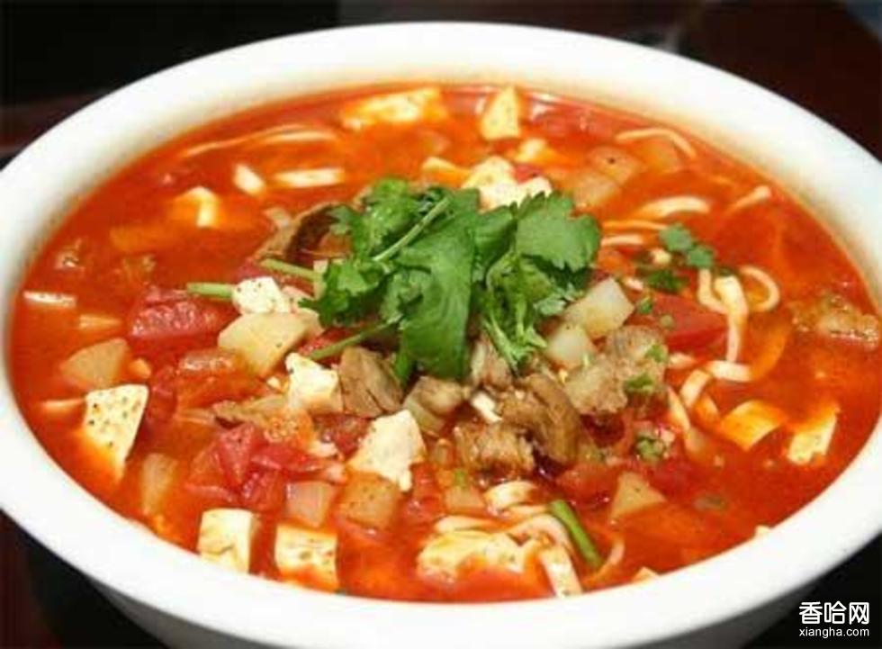 先將面粉揉成面團(tuán)醒好,將羊肉切成大丁炒熟。然后將面搓成筷子般粗,下鍋煮熟,再澆上用羊肉原汁、羊肉丁和新鮮蔬菜燴成的湯,放入辣椒紅油即口可食用,面精肉鮮,風(fēng)味獨(dú)特。