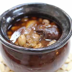 2、燒鑊下油,放入所有料頭起鑊,再放豬紅、豬骨髓,烹酒落二湯調(diào)入所有味料略煮,用濕粉打芡,加入麻油后倒入瓦煲,再放上火爐煲熱,上面放芫荽即成。