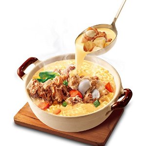 3、 從之前熬好湯底中取出熟排骨200公克及湯頭500㏄,加入調(diào)味料調(diào)味后倒入面碗中即可,一碗美味的豬骨湯面就可以了。
