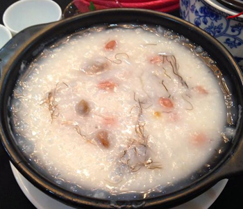 3、大米洗凈加適量水煲開,放處理好的淡菜和咸豬骨繼續(xù)煲成粥即可。