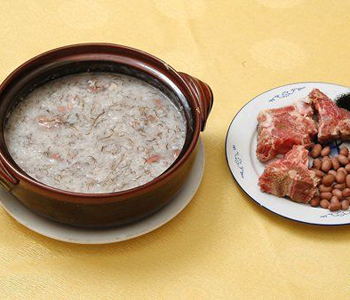 咸豬骨粥是廣東省傳統(tǒng)的漢族名菜,屬于粵菜系。佛山的傳統(tǒng)美食咸豬骨粥是先將豬骨頭洗凈,用白酒和鹽閹咸,然后直接放到火里烤至干水,再拿起來,刷洗干凈后再晾干待用。在烹飪咸豬骨粥的時候,將煮熟炒干的黃豆與腌制好的豬骨一起下鍋熬粥,不出一會就回問道咸豬骨粥的誘人香味,當熬煮的時間成熟了,就可以吃到香噴噴的咸豬骨粥啦!
