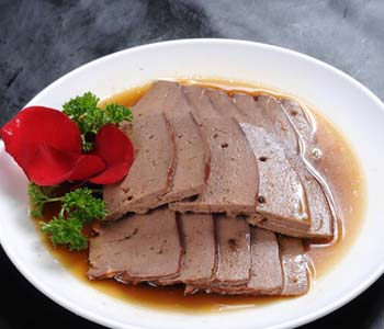 3、離火,放入豬肝焐至斷生(切開不見血水),冷卻,浸泡,食用時切片裝盤即可。