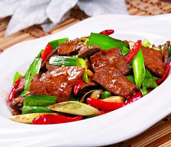 3、熱油鍋里放入花椒、豆瓣、蔥白炒香后,放入豬肝爆炒再加青紅辣椒,炒幾十秒鐘,加味精即可,裝盤。