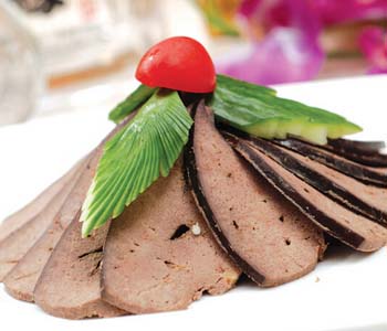 材料:豬肝2000克,調(diào)料精鹽100克,料酒20克,味精15克,蔥段20克,姜片10克,醬油50克,香料包1個(內(nèi)裝花椒、八角、丁香、小茴香、桂皮、陳皮、草果各適量)