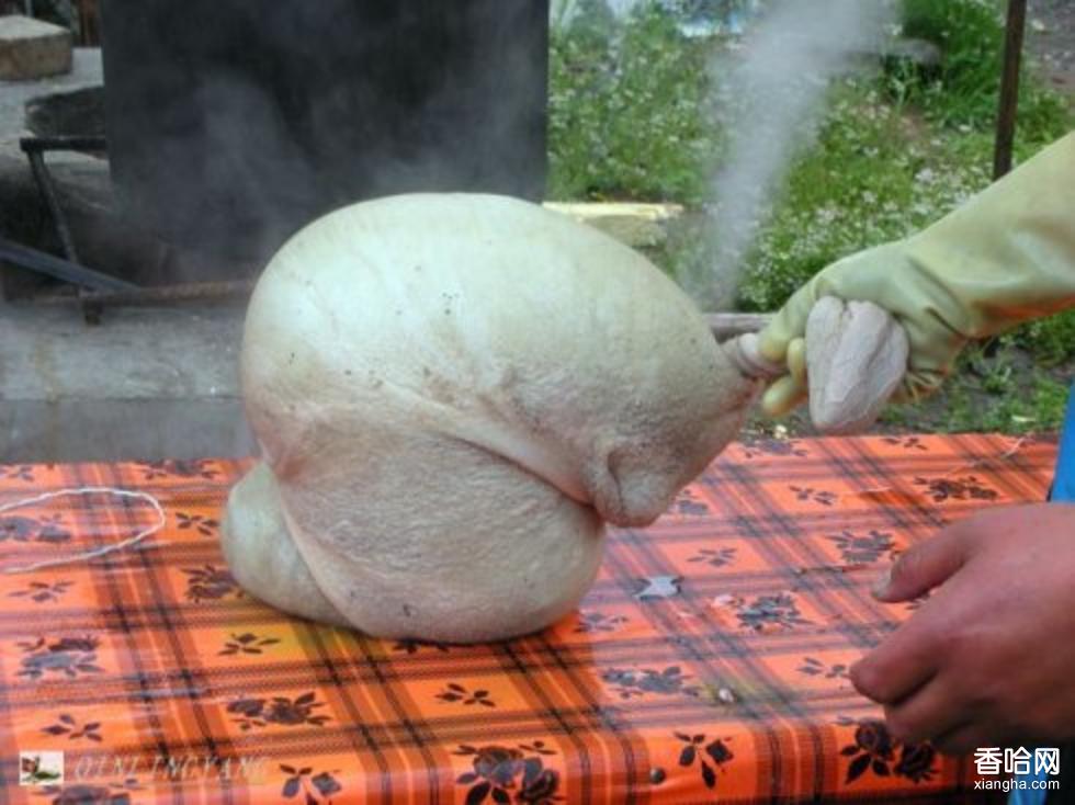制作前,先撿一些比拳頭小的鵝卵石洗凈,壘起放在火中猛燒。然后把剛剛宰殺的新鮮羊的骨肉分離,關(guān)把肉割成小塊,佐以食鹽、花椒粉等調(diào)料拌勻,把羊肚洗凈。待把石頭燒紅以后,就把拌好了調(diào)料的肉塊裝一小部分到羊肚內(nèi),隨之裝進(jìn)幾塊石頭,之后用手有外面反復(fù)搓揉羊肚,直至把肉塊和石裝完,再用繩子扎緊羊肚口。隨著肚內(nèi)蒸氣的增多,溫度的升高,肚皮越脹越大,這時(shí)稍放掉一點(diǎn)氣,不至把羊肚皮崩破,并讓其在草地上輕輕翻滾,待熱氣降溫,肚內(nèi)的石塊停止跳動(dòng)時(shí),在肚皮上用刀劃開一點(diǎn)小口,取出積在里面的肉汁,然后將肚皮整個(gè)劃開。
