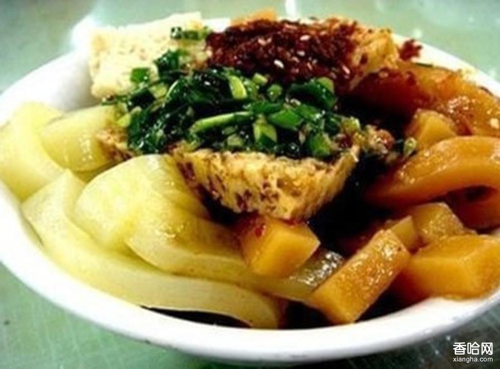 臨夏釀皮子享譽(yù)三隴,已成名小吃。積石釀皮和臨夏釀皮是一樣的,它是各族人民非常喜歡的風(fēng)味小吃。上好的釀皮子色澤鮮亮,質(zhì)地柔韌,吃起來(lái)咸、酸、香、辣、鮮五味俱全,清爽適口,別具風(fēng)味,特別是盛夏酷暑,一碗釀皮子下肚,精柔爽口,全身清涼,暑氣頓消。