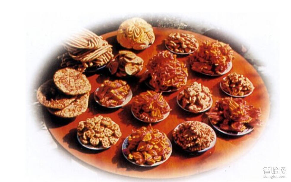 干馃為精美的油煎食品。積石山縣穆斯林在節(jié)日和喜慶日子,必做干馃招待客人,并饋贈(zèng)親戚、鄰里。?干馃有嵌花、蜜餞和造型之分。做“造型馃馃”,則將各色面團(tuán)搟開(kāi),切割組合,捏成各種花卉、昆蟲(chóng)、飛禽等吉祥物形狀,下鍋油煎而成,形態(tài)生動(dòng),惟妙惟肖,這種馃馃簡(jiǎn)直是一種精美的藝術(shù)品,拿起來(lái)舍不得放到嘴里。干馃地制做充分表現(xiàn)了穆斯林婦女的心靈手巧和審美情趣。