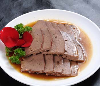 3、離火,放入豬肝焐至斷生(切開不見血水),冷卻,浸泡,食用時(shí)切片裝盤即可。