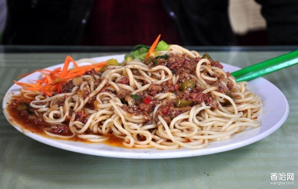 青海風(fēng)味面食。拉面出鍋后不帶湯,用刀切成短條,倒入用粉絲、肉末、辣椒和少量菜做好的混菜鍋內(nèi)混炒而成。出鍋前的制做等同于拉面的制做,出鍋后的混炒法又相近于炒面片的混炒,但口味與兩者各不相同。先長后短,先煮后炒、面菜混一。