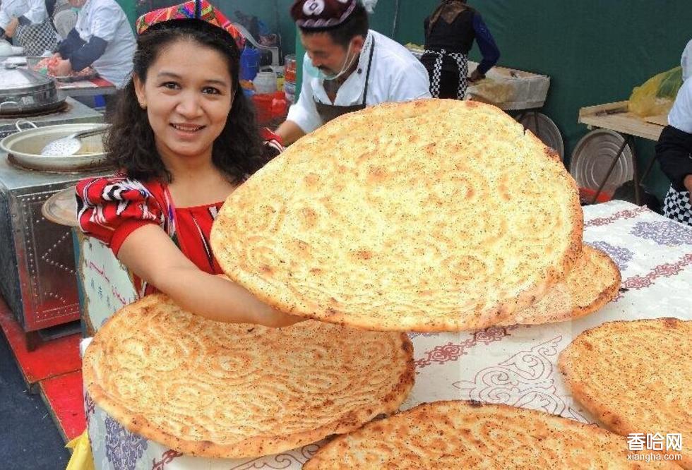 馕是維吾爾族群眾日常生活中不可缺少的最主要的食品,也是維吾爾族飲食文化中別具特色的一種食品。維吾爾族食用馕的歷史很悠久,且種類繁多。其中有一種直徑足有40-50厘米的“喀克洽”大薄馕,是馕中之王。大薄馕是以發(fā)酵的面為主要原料,輔以洋蔥、鹽、水等佐料,用馕炕(吐努爾)烤制而成,呈圓形。馕由于含水少,久儲不壞,便于攜帶,加之香酥可口,富有營養(yǎng),也為其他民族所喜愛。
